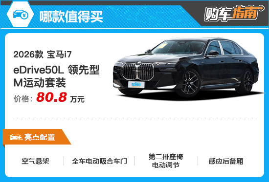 综上所述,eDrive50L领先型M运动套装在2026款宝马i7全系车型中拥有着更高的性价比,消费者在购车时可以优先考虑。