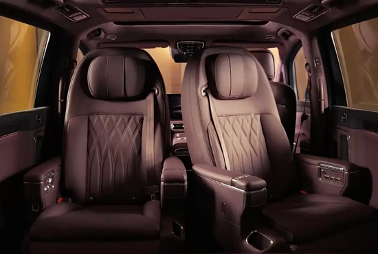 第二排为车内核心亮点,提供伊姆斯躺椅,支持靠背、腿托、脚踏一键联动调节,可实现45度迎宾、90度观影、180度对坐等多种旋转模式。实体调节按键设置于扶手内侧,便于乘客盲操作。此外,车顶预计配备娱乐屏,支持多屏媒体流转,进一步提升座舱娱乐体验。