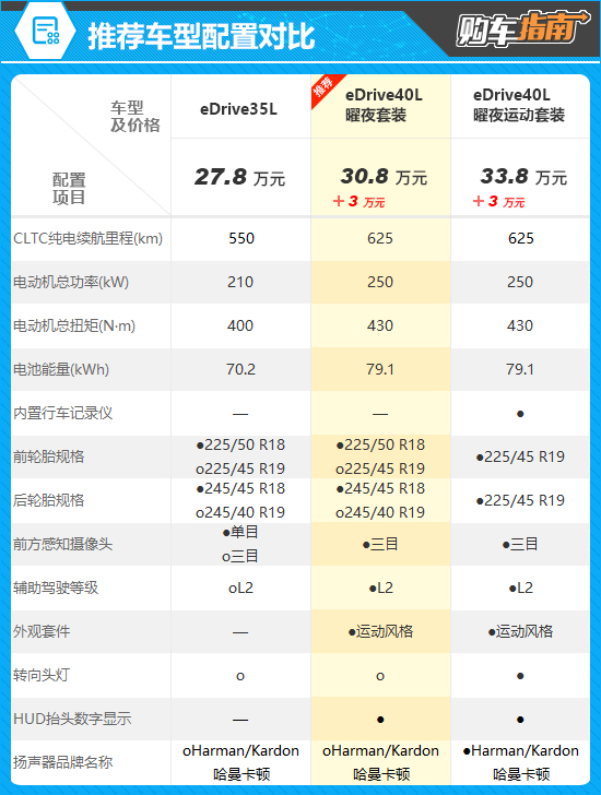 推荐车型为eDrive40L曜夜套装,售价30.8万元。相较入门的eDrive35L车型,其不仅电动机参数更高,而且CLTC纯电续航里程也提升至625km,能够有效减缓里程焦虑。除此之外,再加上运动风格外观套件、L2级辅助驾驶以及HUD抬头数字显示,结合3万元的差价来看,属实是物超所值。
