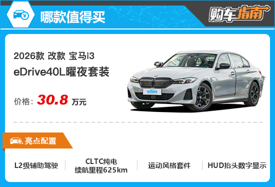 综上所述,对于2026款改款宝马i3,售价30.8万元的eDrive40L曜夜套装性价比最高,消费者在选购时可以优先考虑。