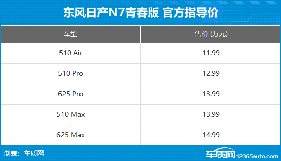 2月24日,东风日产N7青春版正式上市,共推出5款车型,官方售价11.99-14.99万元,上市限时价10.99-13.99万元。