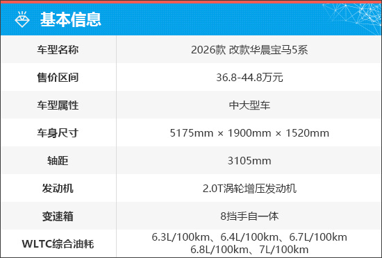 2026款改款华晨宝马5系共推出7款车型,官方指导价为36.8-44.8万元。相比老款车型,新车起步售价大幅下调,购车门槛进一步降低。