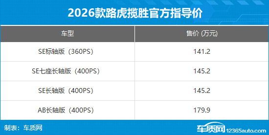 3月3日,车质网从路虎官方获悉,2026款路虎揽胜正式上市,此次共推出4款车型,官方指导价141.2-179.9万元。新车主要是针对售价和款型有所调整,并且配置进一步升级。