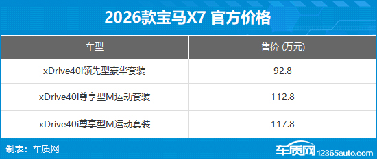 2026款宝马X7正式上市,新车推出3款xDrive40i车型,售价92.8-117.8万元,核心变化为生产地转移至泰国工厂,且除特殊车漆外不再支持个性化定制。