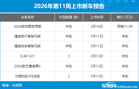2026年第11周(3月9日-3月15日)上市新车预告