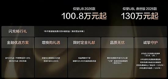 3月6日,2026款仰望U8/U8L正式上市。其中,2026款仰望U8售价100.8万起,重点针对易四方性能进行升级,2026款仰望U8L鼎世版售价130万起。两款车型的CLTC纯电续航里程均为230km,CLTC综合续航里程1205km。
