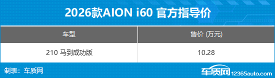 2026年3月2日,AION i60马到成功版正式上市,售价10.28万元。作为新增车型,其在保留配置与交互体验的同时,价格门槛进一步降低,性价比得到显著提升。官方不仅为新车提供充电礼、质保礼、流量礼、服务礼和品质礼的五重好礼,而且还推出了限时置换福利。3月入手AION i60其他在售版本可享8000元置换补贴,广汽老车主专享9000元补贴。