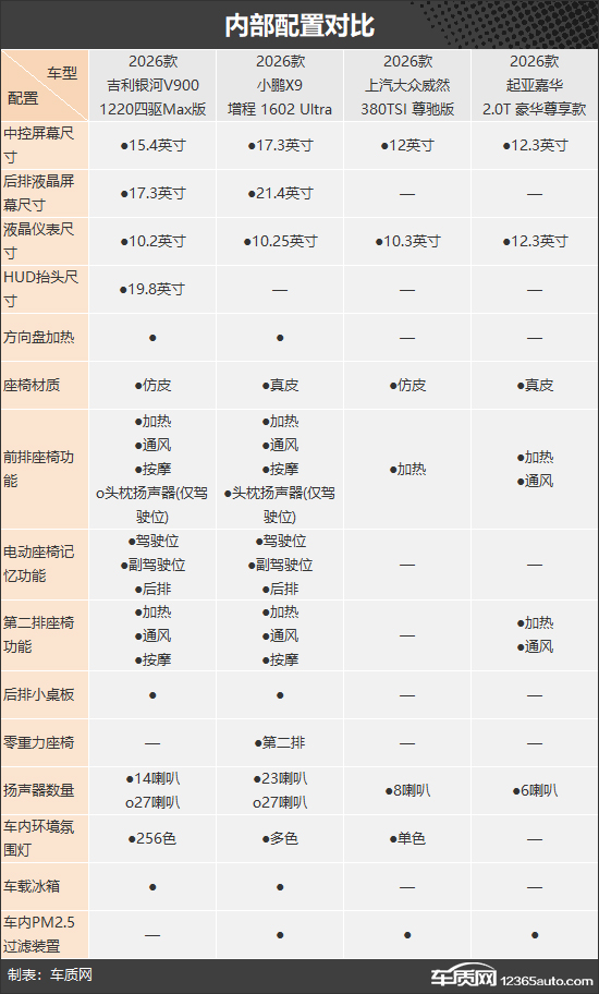 内部配置方面,小鹏X9的中控屏幕尺寸、后排液晶屏幕尺寸最大,并且独享驾驶位头枕扬声器、第二排零重力座椅;吉利银河V900的表现也毫不逊色,独享19.8英寸HUD抬头数字显示。相比之下,上汽大众威然的舒适配置明显不足,是唯一没有前排座椅通风、第二排座椅功能的车型。
