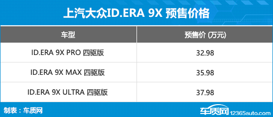 2026年3月30日,上汽大众ID.ERA 9X正式开启预售,新车定位为大型SUV,采用增程动力,预售价格为32.98-37.98万元。此外,官方还推出奢享升舱礼、高定车漆礼等多项购车权益。