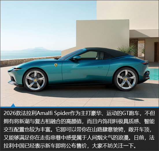 13.5s,伸出双手,你可以获得一个与天空亲密接触的绝佳机会;13.5s,也恰好是一台法拉利Amalfi Spider敞开车顶的时间,等待你启动它共同实现一场自由与速度的约定。提及法拉利经典GT跑车,相信多数人都会联想起优美的车身姿态、兴奋刺激的动态表现。2026款Amalfi Spider的出现,将以更低的门槛帮助法拉利拥趸完成梦想。它的魅力究竟如何?本期《新车图解》将为您详细解读。