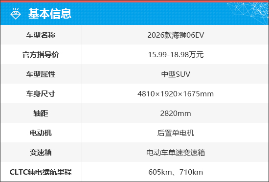 2026款比亚迪海狮06EV定位为中型SUV,共推出8款车型(含4款选装天神之眼B车型),官方指导价为15.99-18.89万元,车辆全系搭载后置单电机,采用纯电动力,CLTC纯电续航里程分别为605km、710km。