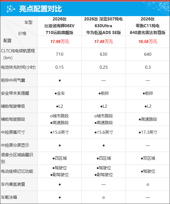 具体到车辆配置层面,我们挑选了售价尽可能相近的车型。对比来看,2026款比亚迪海狮06EV的续航、补能效率表现最佳,并且在安全方面也很出众。例如,其CLTC纯电续航里程达到710km,电池快充时间仅需0.15小时,还独享全车安全带未系提醒、前排中间气囊。同时,车内香氛装置和车载冰箱也无需选装。2026款深蓝S07纯电的辅助驾驶功能和智能配置同样值得肯定,和2026款比亚迪海狮06EV一样,支持选装城市路段辅助驾驶功能,提供中控屏分屏显示、四区域语音唤醒识别。相比之下,2026款零跑C11纯电虽然拥有尺寸更大的中控屏幕、更低的价格,但整体配置表现一般。