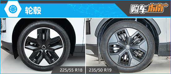 后驱Plus标配18英寸五辐空气动力学轮毂,轮胎规格为225/55 R18,并支持19英寸五辐空气动力学轮毂的选装,轮胎规格为245/45 R19;后驱长续航版Ultra和双电机四驱高性能版Ultra均标配19英寸五辐空气动力学轮毂,并支持20英寸五辐空气动力学轮毂和20英寸五辐钻石切割轮毂的选装,轮胎规格均为245/40 R20;顶配车型提供19英寸五辐空气动力学亚黑轮毂,轮胎规格为235/50 R19。