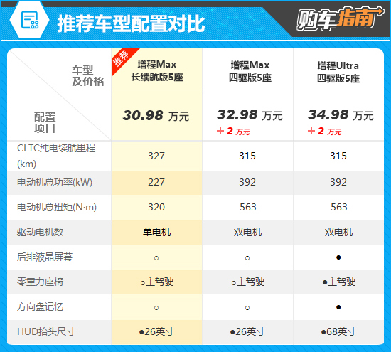 根据配置对比不难发现,增程Max四驱版5座相比推荐车型仅升级为双电机四驱系统,动力更强,但CLTC纯电续航里程有所下降。考虑到单电机版的动力已足以应对大多数用车场景,因此为这项升级付费的必要性不高。增程Ultra四驱版5座在舒适性配置上更进一步,但多数属于锦上添花,对日常用车体验并无本质提升,同样不作推荐。