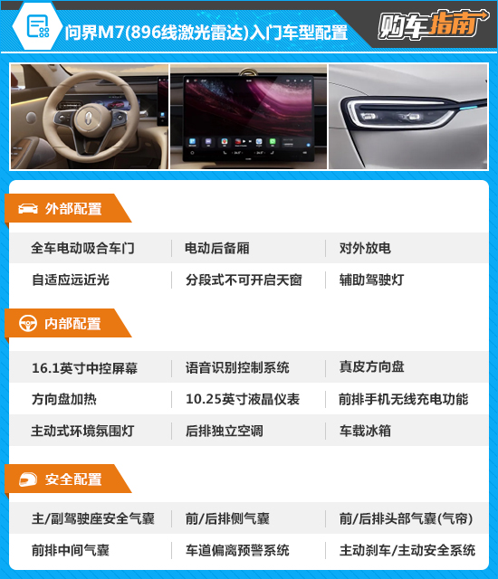 问界M7(896线激光雷达)入门车型的配置表现可圈可点,配备了大量实用性与舒适性功能,如全车电动吸合车门、电动后备厢、后排独立空调以及车载冰箱等均为标配,不仅能够满足日常用车需求,还有效提升了高级感,所以成为了本次的推荐车型。