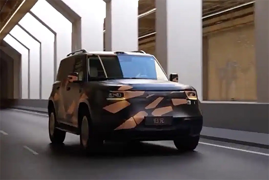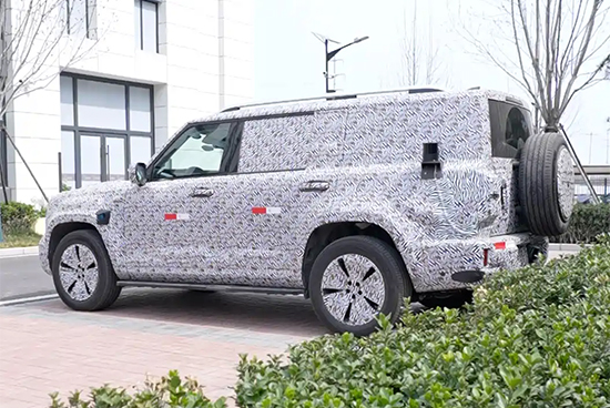 车身侧面具有硬朗的车身结构,展现出硬派复古风格。车尾部分近乎垂直的后窗与外挂式全尺寸备胎相搭配,进一步强化了硬派越野属性。尾灯采用纵置布局,内部或为全LED光源。