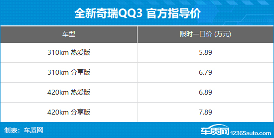 3月30日,全新奇瑞QQ3正式上市,新车共推出4款车型,限时一口价5.89-7.89万元。此外,现在购车还可以享受包括金融礼、救援礼、流量礼、升级礼、质保礼、安芯礼、升舱礼在内的购车权益。