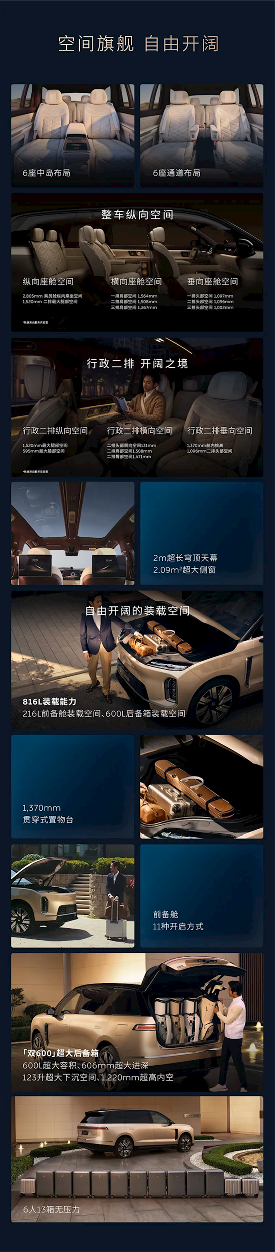 ES9车长5365mm,轴距3250mm,是中国目前体量最大的纯电SUV,舱内挑高1.37米,二排1520mm腿部空间同级第一,前后备箱总容积816L,兼顾行政尊贵与装载需求。