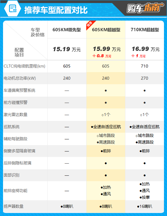 710KM超越型相比推荐车型,拥有更长的CLTC纯电续航里程和稍强的动力,同时增加了前排座椅按摩及16个扬声器音响系统,但考虑到产品力提升幅度与1万元差价的匹配度一般,其吸引力相对有限。