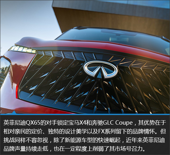 英菲尼迪QX65并非车迷期待中英菲尼迪FX系列的完美复刻,但在品牌资源有限的前提下,其凭借同样优雅的设计以及丰富配置和主流动力,在豪华轿跑SUV市场中仍有一战之力。不过,从英菲尼迪目前国内的现状来看,这款小众轿跑SUV引入国内的可能性并不大。