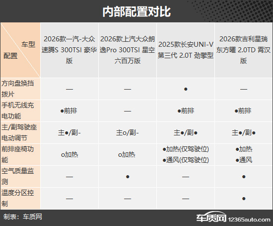 内部配置方面,吉利星瑞 东方曜整体表现更为突出,不仅独享温度分区控制、副驾驶座椅加热与通风功能,还配备主副驾驶座电动调节,用车舒适性与便利性更佳。相比之下,上汽大众朗逸Pro整体配置表现一般,与另外三款车型存在一定差距。