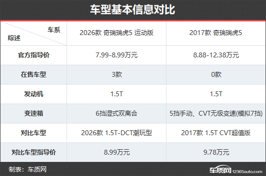 2026款奇瑞瑞虎5运动版共推出3款车型,官方指导价区间为7.99-8.99万元,价格方面相比老款车型得到进一步下探,尤其是顶配版,仅比老款车型的入门版贵了1100元,可见厂家的诚意。本次对比选择了两款价格接近的车型,以便能够更加直观地看出新老款车型在配置层面的具体差异。