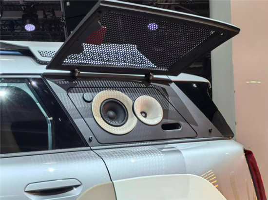 这台车最大亮点在于其高度集成的专业级户外音响系统,音箱直接嵌入车身结构,以铸造聚合物花岗岩材质打造,为开放空间下的高品质声音表现提供理想载体。高音、中音音箱直接集成于车身部分,而低音和超低音音箱则被放置在车尾。