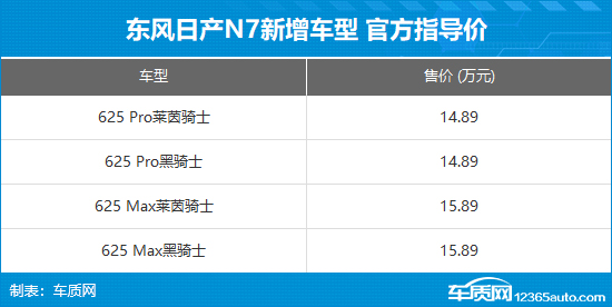 2026年4月27日,东风日产官方宣布,日产N7黑骑士正式上市,共推出4款车型,官方指导价14.89-15.89万元,限时权益价13.49-14.49万元。新车提供莱茵骑士和黑骑士两种不同风格的外观可选,对应车身颜色分别为莱茵绿和曜石黑,此外还将配备19英寸轮毂。
