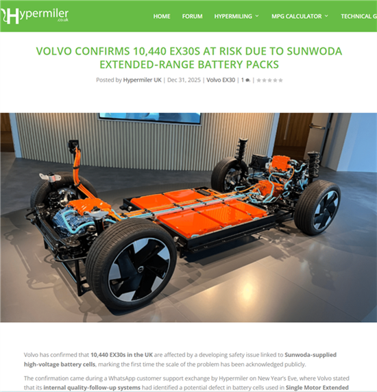 其中,沃尔沃已确认,英国有10,440 辆 EX30受到与Sunwoda(欣旺达)动力电池包的影响。