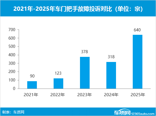 此外,在低温结冰环境下,隐藏式门把手弹出失效问题频发,成为北方地区用户的高频痛点;不少车主还反映,隐藏式门把手故障维修成本高昂,单次维修费用可达数百至数千元;部分汽车产品还存在门把手操作空间不足、机械应急装置隐蔽难操作等问题,对于日常用车造成极大困扰。据车质网数据显示,近五年“车门把手故障”投诉整体呈现出攀升态势,2025年的投诉量达到640宗,五年间暴涨逾6.1倍。