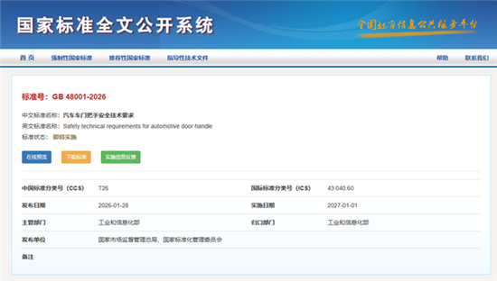 近日,继2025年5月公开征求意见后,工业和信息化部正式发布强制性国家标准GB 48001-2026《汽车车门把手安全技术要求》(以下简称《技术要求》),并将于2027年1月1日起开始实施。这一标准将重点解决车门外把手操作不便和事故后无法开启、车门内把手操作便利性差、部分场景下功能丧失等痛点问题。