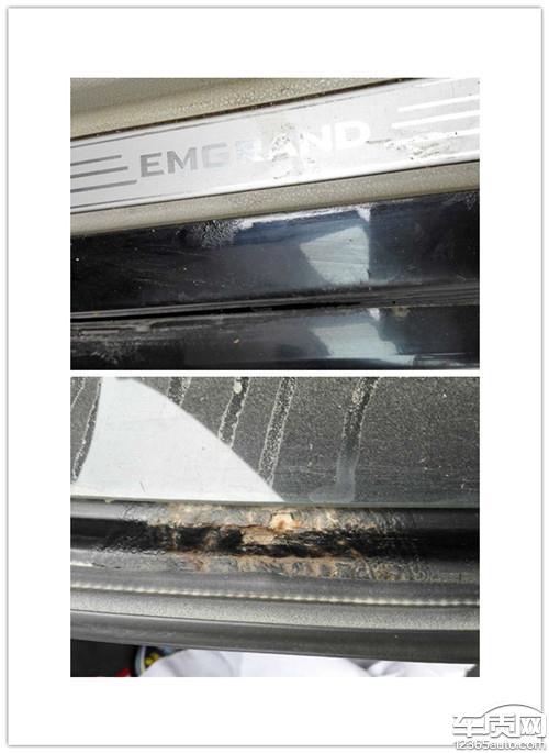 2011年5月底买车,帝豪EC7181.8L手动高配,先在已经开了35878公里,说一说现在存在的问题:1、发动机基本平稳,但是噪音比新车大了很大,现在方向盘抖动厉害,并且方向不精准(有图片,图片方向盘就是轮胎正方向,可以看到方向盘歪的很严重),并且该车跑偏严重。2、变速器挂到特别是1挡和倒挡总是不能像其他车辆那样的顺滑,如果不用力根本不知道有没有挂当到位,挂当没有一丁点的吸入的感觉,说真的都没有大众桑塔纳好挂当,更不能与现在的比亚迪、长城之类的比;3、转向系统有噪音。4、前后桥及悬挂系统,四个轮胎的减震系统我认为现在已经瘫痪,根本没有弹簧在起到减震作用,过很小的坎都是“duangduangduang”的生硬;5、现在车辆CD已经不能使用,启动车辆CD是断电状态,中间的开关旋钮已经裂开脱落,现在不得不拿下来;6、全车生锈问题最为突出、严重,让人根本没有办法忍受,不知道现在的吉利品牌怎么跟人家比亚迪、长城等国产品牌、合资品牌竞争(大量图片)。四个车门内侧好几处生锈,迎宾踏板处生锈,后背箱盖生锈,引擎盖多出生锈、后备箱好几处生锈。发现生锈时才跑了一万两千公里,买了这么短时间,跑这么短路程就生锈,这属于严重质量问题。要求维修好并赔偿折旧费。7、购车时真皮座椅是经销商对我宣传的一大卖点,结果这么的不耐用啊!我的车都是按时保养的,一直很爱惜都是套着座套的,先前看见有的地方有些小裂纹,当时没引起重视,总觉得真皮的不会这么快坏的,后发现大面积脱皮,现在全车坐骑有皮子的地方全部开裂,这质量差的不是一般的差了。