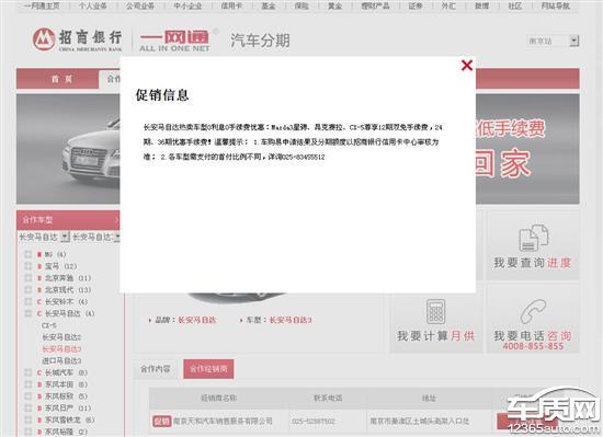 与招商银行信用卡合作0利息0手续费12期双免分期购车为虚假宣传或销售欺诈行为,4S强制收手续费。以下是在招商银行信用卡官网上发布的促销信息:长安马自达热卖车型0利息0手续费优惠:Mazda3星骋、昂克赛拉、CX-5尊享12期双免手续费,24期、36期优惠手续费!温馨提示:1.车购易申请结果及分期额度以招商银行信用卡中心审核为准;2.各车型需支付的首付比例不同,详询025-83455512。与招商银行信用卡中心咨询沟通过,招商银行的确有此项促销活动,但与长安马自达4S店咨询沟通后的结果是,要收取手续费,而且4S店人员不避讳的说,所有4S店全都要收手续费。