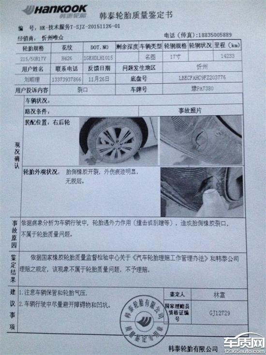 韩泰轮胎厂家回复:轮胎厂家已出具了鉴定结论,系外力原因造成侧面裂口,非轮胎质量问题