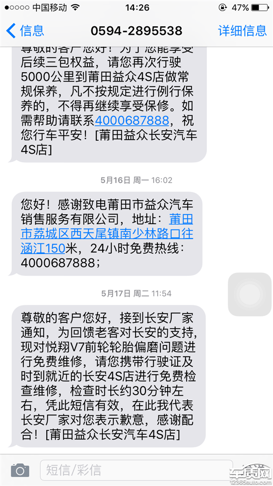 长安悦翔V7前轮吃胎偏磨保修期内不免费2016-05-31车型:2015款 1.6L 手动 乐享型 国IV