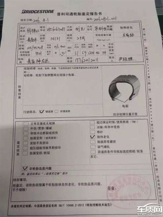 我在16年7月20日发现一条轮胎靠近轮毂处开裂(龟裂)、一条轮胎靠近轮毂处为环形裂缝,另外4个轮胎防滑纹凹进部分均有裂纹。16年8月1日去4S店,尔后由4S店将我带至普利司通售后处,售后处看后表示无条件更换,但在更换过程中接普利司通总部通知,不予更换,接着开出一张鉴定报告,结论为胎体老化非轮胎品质问题。我的车一直在市区行驶,目前里程数为14100公里。(附鉴定报告)。