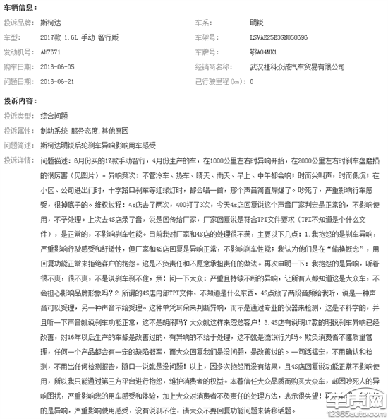 自从在车质网平台抱怨后,没有收到4S店和厂家任何电话和短信处理意见,厂家居然回复:“经了解,客户反映车辆问题经检查,非产品质量问题”,结果把我的这个问题给关闭处理完了。我想问:我的车进4S店什么时候检查过刹车片和刹车盘?检测判定的标准是什么?你们的检测报告在哪里?一直异响是“非质量问题”,难道出了人命才是质量问题吗?现在倒好,刹车异响未解决,天窗异响又出来了,只要是天窗在全关闭状态下,车辆稍有颠簸就会出现哒哒哒的异响。怎么解决?对厂家处理问题的方式和方法真心不满意!希望厂家正视问题,对消费者的抱怨负责!