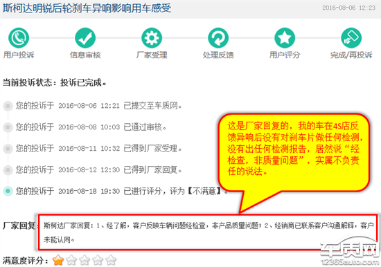 斯柯达厂家回复:经了解,客户车辆已进站检测,车辆情况正常;经销商已与客户沟通解释,客户未能认同。