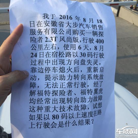 本人2016年8月18日在安徽汽车销售服务有限公司购买一辆福特探险者,2.3T风尚版,于2016年8月25日中午在行驶的过程当中方向盘突然失效,由于驾驶员操作得当未能造成事故发生,后联系福特中国,来拖车将我们的车辆拖至安徽汽车销售有限公司维修部,两天后收到大步工作人员告知该车辆不给退换,只给予维修,让我无法接受,第一,我还未来得及买购置税及上牌2.前后五天时间我一共就行驶了460公里3,在我们一再要求下,福特中国并未给予该车的检测书面报告.现在我们投诉无门,请求相关部门给予帮助。