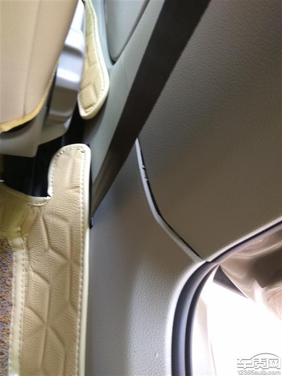9日开车出去,坐在车后座的人发现车辆前排座位旁边的两侧横梁内饰拼接处缝隙不一样,右侧缝隙特别大,应该是组装的过程中没有安装好,上传照片为证。