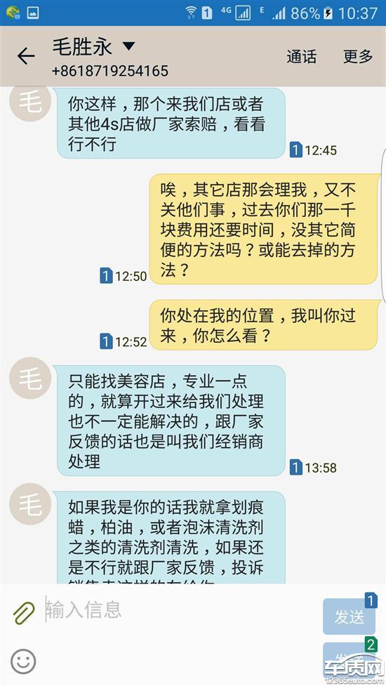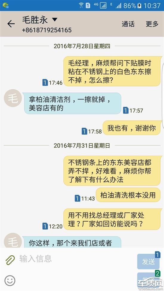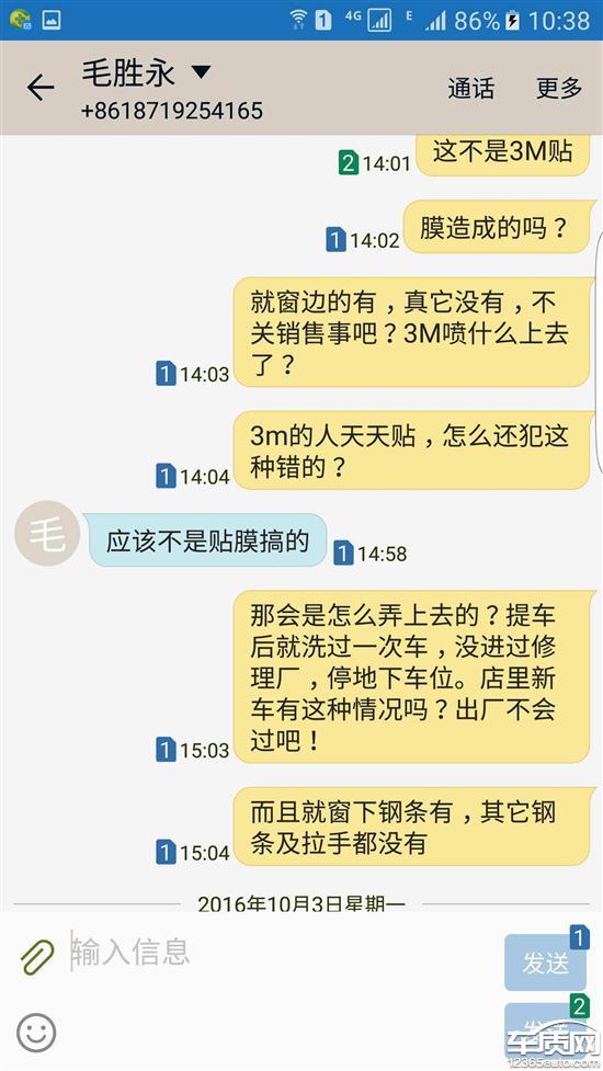 今年7月15日在该店买车,注明赠送玻璃贴膜、套件等,平时停小区地下停车场,7月底回4S店贴膜后交车给我时发现车窗镀铬亮条上有很多白色斑点,就和售后经理说,对方说回去一擦就掉,当时近下班,我也急着回广西,但回去擦不掉,于是打电话给店里,店里说叫回店拍照向厂家申请索赔,国庆去店拍照申请,过了两天店里回复说,厂家说这是空气中自然氧化的(车门上和尾门上也有亮条但都没有白点,就窗边的有白点同,所以我肯定不是空气造成),不是质量问题,不愿意赔偿,打电话厂家,厂家说让4S店和我沟通,但4S店又说厂家有个公告,这种情况不赔,才半个月不到的新车我什么也没加装,玻璃膜是4S店赠送安装的,也没到过工地,和有化学品的地方,就在桂林市区里,责任不在我,只能是贴膜时或是原车质量问题造成的,所以要求厂家或4S店更换窗边损坏的亮条。