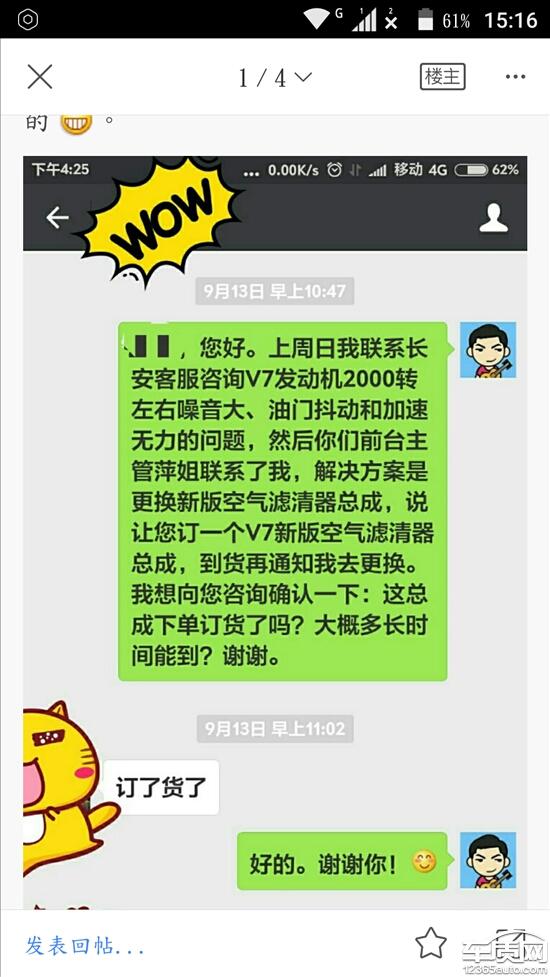 投诉编号:【166182】 投诉时间:2016-11-07 22:47 投诉品牌:长安汽车 投诉车系:悦翔V7 投诉车型:2015款 1.6L 手动 乐享型 国V