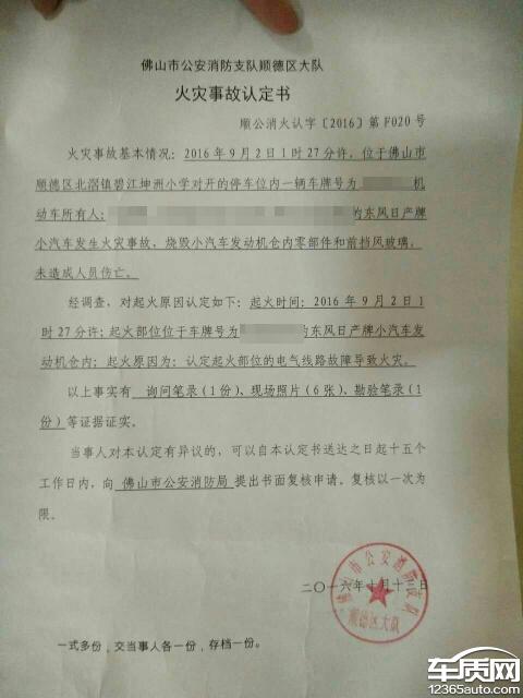 车子购买与2014年6月份。于2016年9月2号凌晨,停自家楼下发生自燃。行车里程才2万多公里,都是在4s店正常维修保养的,从未有过任何的改装。消防出警灭的火。出现火灾后,及时通告4S店,得出的结论是要消防出路起火原因报告,经过一个月左右的调查取证!得出车子排除人为纵火,是车子电气短路导致自燃。拿着起火原因找4S与厂家理赔,厂家以各种莫须有的理由拒绝!真是无良商家,车子质量出问题不与承认!