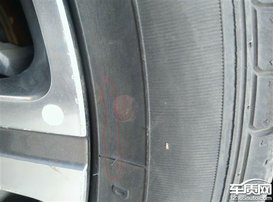 两个前轮轮胎均有不同程度裂纹!影响驾驶安全!右前轮侧面一圈为细小龟裂裂纹,如图圈中左前轮为侧面一长条裂纹,如图圈中轮胎均为原厂轮胎,没有任何维修补胎情况,也没有任何外力擦伤等情况!