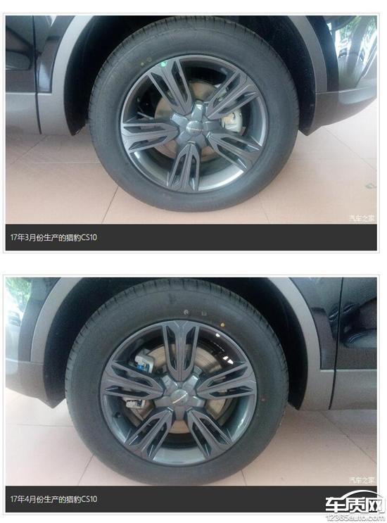 我的车是17年2月份生产的。我是3月份提的车,其他没什么毛病就是刹车软让我实在不能接受。让我更不能接受的是17年4月份以后生产的车刹车盘都加大了,已经到轮毂的位置了。我们以前的都小一号上面有图。既然猎豹厂家都意识到刹车问题了为什么不能给我们的车也改成最新款大的刹车盘呢?就因为刹车软我7月8号那天就追尾前面的车,那时候时速才70左右。真的刹不住制动距离太长。我以前是当兵的在部队就开过猎豹所以出来才选择买猎豹10,可是这刹车让人情何以堪。我们以前都是你军工品牌的小白鼠吗?希望引起各位领导的重视妥善解决我的刹车问。再此希望猎豹厂家能发一套17款4月份加大刹车套件给我予以更换。刹车可是关乎到我一家老小的性命啊!