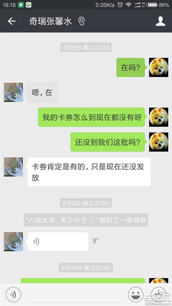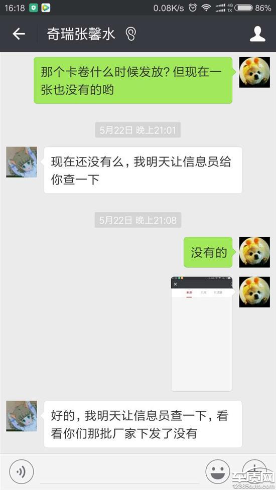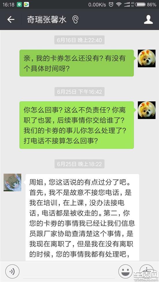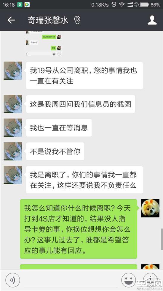 我于2017年5月1日甘肃兰州车展,预订奇瑞瑞虎7 20161.5T手动耀臻版,并于同月9日提车成功,但是展会经销商承诺厂家予以6年12次的免费保养,并会在奇瑞微信公众号内下发卡卷,最慢会于次月发放,可现在时间过去两个多月依然没有任何消息,期间我们多次与兰州区域4S店以及销售沟通联系,只有一句让我们耐心等待,现在接待我们的销售也离职了,并且没有任何相关人员了解负责此事,我们本着支持国产自主品牌的初衷购买了奇瑞,可是这样的服务和售后让我们如何放心?请厂家能给予满意答复。