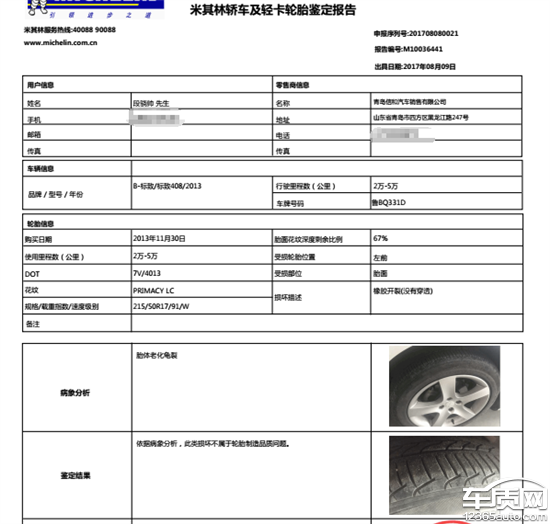 本人于2013年11月30日在4S店购买2013款标致408,在行驶不到一万公里的时候,四条米其林轮胎均出现开裂,由于个人对轮胎不了解以为是正常现象,今年7月份洗车的时候,发现整个轮胎上的裂纹密密麻麻,有很多比较深的裂纹。意识的事关人身安全问题,通过信和4S店像米其林公司发起投诉,4S店售后经理积极配合,拍摄了四个轮胎的照片,提供给米其林公司检测。8月9日上午米其林公司通过电话告知我轮胎开裂属于正常老化现象,不属于轮胎制造品质问题。在电话中声称不会影响安全问题,但是从提供给我的检测报告当中并没有提及的是否有安全隐患问题。试问哪位消费者看到轮胎的裂纹情况这么严重还敢放心大胆的使用。之后我在汽车论坛里浏览同款车型轮胎问题,发现米其林PRIMACYLC(博悦)轮胎开裂属于普遍现象,而且维权投诉的不在少数,但米其林对每位消费者的反馈态度相差很大,只给部门消费者更换了新的轮胎。如果真的是米其林厂家声称的正常老化现象,我一共才开了2万5000公里就老化成这样,以后谁还敢买米其林的轮胎。因为对米其林告知的属于正常老化现象不予更换的反馈不满意,想通过贵网站保护自己的合法权益。