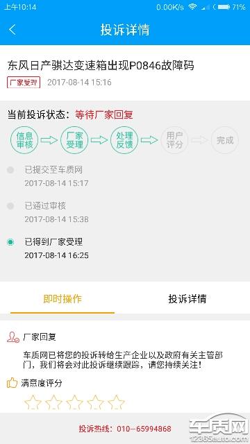 8月14号投诉的问题一直显示厂家已经受理 但是就是一直没跟我联系给出坚决办法!这个时效也太差啦吧!4S店有问题不给我解决!厂家受理也不给抓紧解决!对日产好失望!