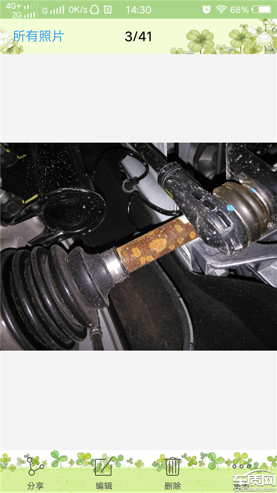 在这月8月11号提的车,今天去装发动机地盘盖子,修车店把车子掉起来才发现的,左半轴全部生锈,开车的时候心里都不放心,担心自己的安全!大家都顶起来,别克威朗,