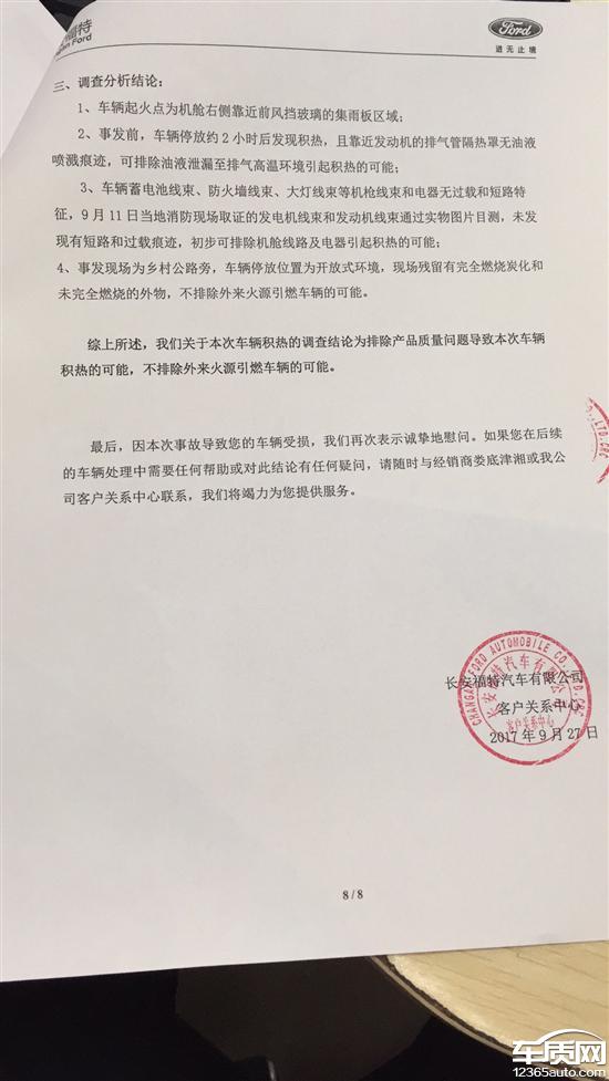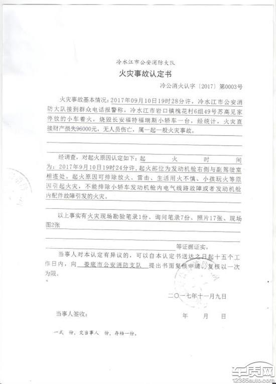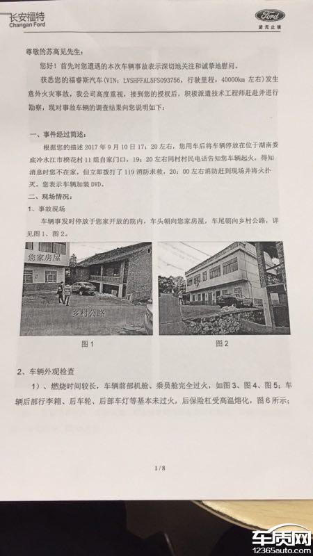 买了2年半的长安福特福睿斯自动挡低配,2017年9月10日我下班后把车辆停家门口2小时后车辆突然起火,当时本人不在家中,由村里其他村民报警随后派出所,消防赶到现场扑灭,由于事故发生在傍晚,所有第二天娄底福特4S店来人勘察现场并向厂家反馈,在一周后的样子厂家工程师同本地消防队到了现场取证让我等消息!10月底的时候收到厂家的结论,11月份收到消防队的结论,面对这俩份不同的结论我也是没办法了,厂家说不是车的原因,消防队说不是外来因素原因,本人在此想问一句那到底是哪里的原因?厂家在出具报告后就没音信了,2地4S店都在推诿,宁可打官司也不说怎么处理这件事,可怜百姓辛辛苦苦月供供的车就这么没了,普通百姓维权无门!